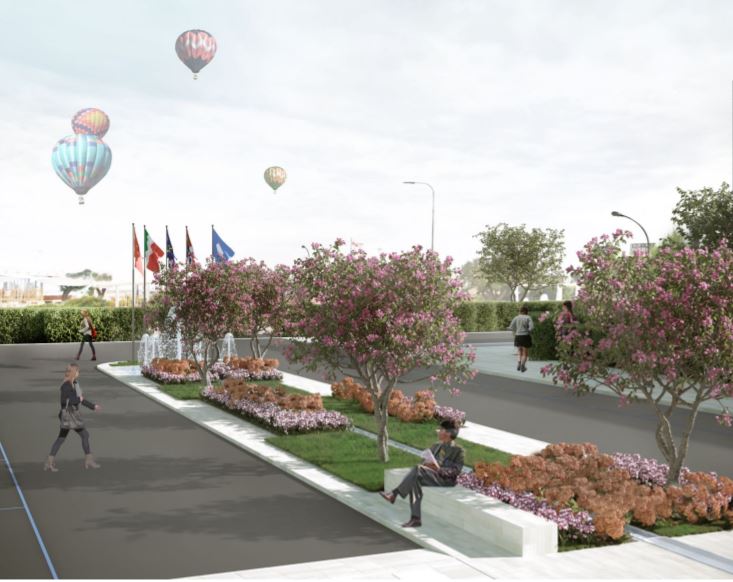 Per quanto riguarda il dettaglio dell’intervento nell’area centrale della piazza di Tirrenia, l’Amministrazione comunale ha accolto il progetto proposto dalla Confcommercio di Pisa e rielaborato dall’uffici tecnici comunali, pensato per riqualificare l’area centrale della piazza di Tirrenia, dove è maggiore l’affluenza di persone sia nella stagione invernale che in quella estiva. Il progetto prevede la realizzazione di un’aiuola ornamentale posta al centro della Via Belvedere, che sostituirà circa 20 posti auto, composta da parti a verde pubblico, alberature, piante erbacee e prato pronto e parti pavimentate in travertino, materiale già esistente nelle zone adiacenti. Nella parte finale, lato ovest, della nuova aiuola sarà realizzata una fontana ornamentale composta da una vasca all’interno della quale saranno presenti cinque ugelli a getto d’acqua variabile, la stessa aiuola sarà percorsa da un canale centrale per tutta la sua lunghezza, da est a ovest, fino a raggiungere la vasca della fontana; nella parte finale ad est verrà realizzata una meridiana, ovvero un orologio solare che richiama la memoria storica degli stabilimenti cinematografici di Tirrenia.