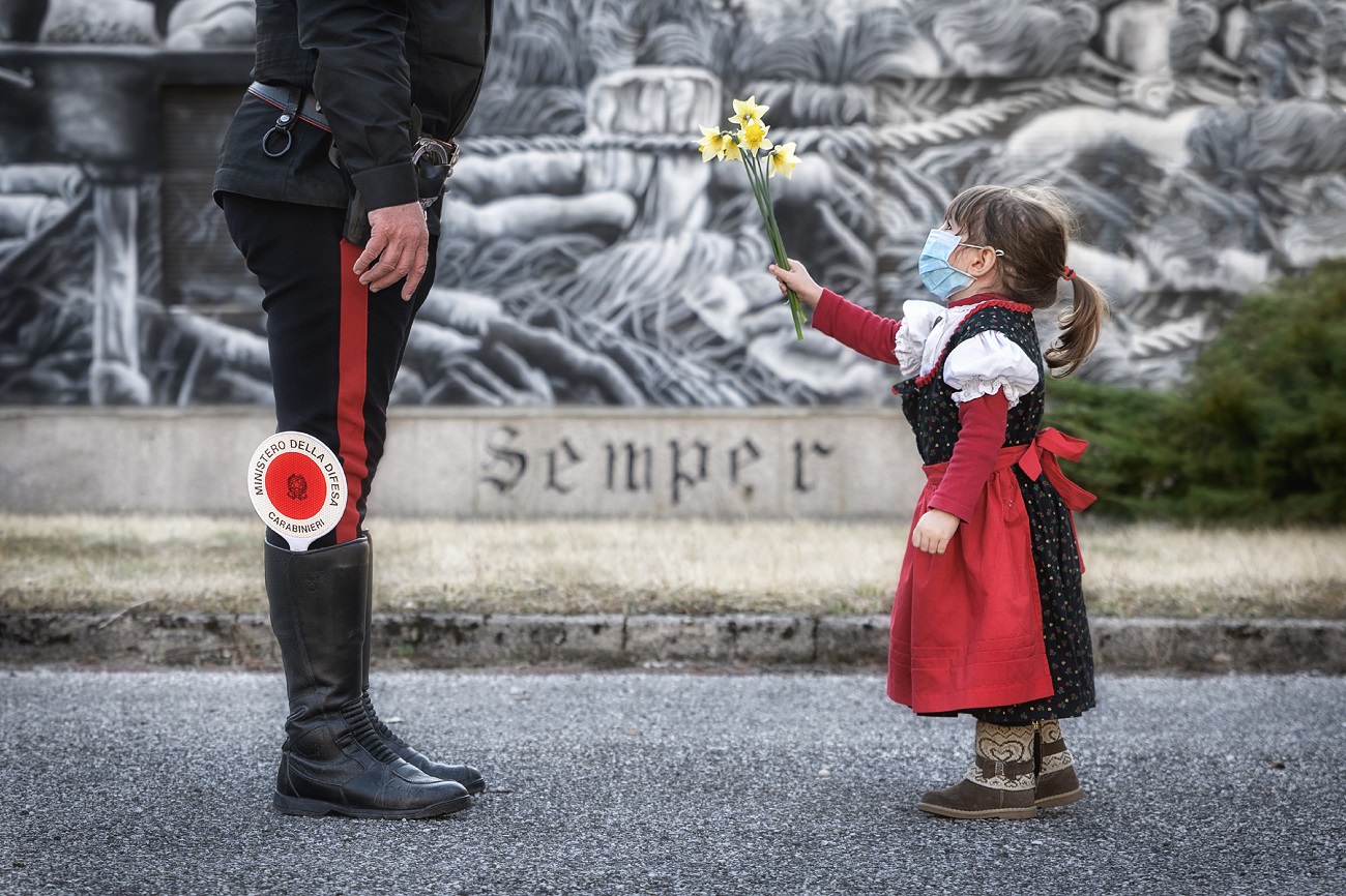Una bambina con la mascherina consegna dei fiori a un carabiniere. È questo lo scatto di lancio del Siena Awards 2020, il festival dedicato alle arti visive che dal 24 ottobre al 1 dicembre 2020 trasformerà Siena nella capitale mondiale della fotografia. La foto scattata dal carabiniere Giuseppe Ulizio, di stanza a Udine, immortala il gesto gentile di una bambina che, con la mascherina, offre dei fiori come segno di riconoscenza al militare, per il lavoro svolto dalle forze dell’ordine, durante l’emergenza del Covid-19.