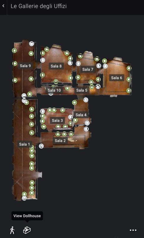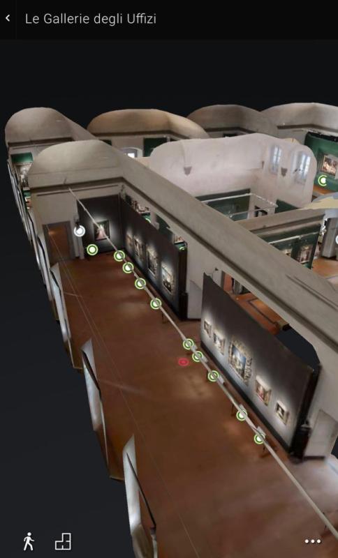Grazie ad una tecnologia all’avanguardia nella realizzazione di tour virtuali le sale del museo, minuziosamente riprodotte in ogni singolo dettaglio con tutte le loro opere (sono in tutto 55) possono essere viste dall’alto, nella forma di visualizzazione detta a “casa delle bambole” (“dollhouse”), oppure immergendosi in esse e camminando virtualmente al loro interno, fermandosi davanti ai quadri, proprio come si farebbe nel museo. Ogni dipinto può essere studiato da vicino e, cliccando sulla corrispondente didascalia, appaiono tutte le informazioni essenziali sull’opera, in italiano o in inglese; per i principali capolavori è incluso anche un link alla scheda dettagliata dell’opera sul sito degli Uffizi.