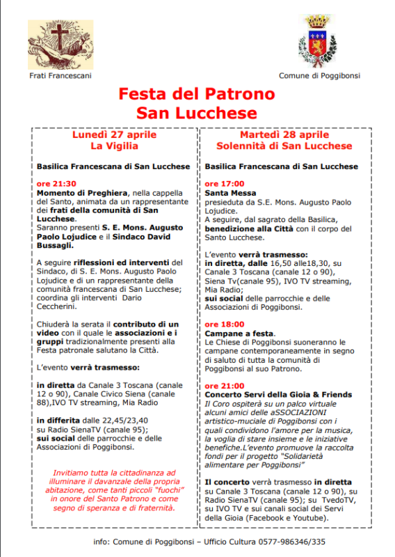 Come tutti sapete non sarà possibile procedere né alla consueta e tradizionale accensione dei falò in onore del santo né alla processione per le vie della Città con il Corpo di San Lucchese né alla celebrazione a porte aperte della Santa Messa né tantomeno al consueto allestimento della festa all'esterno della Basilica.