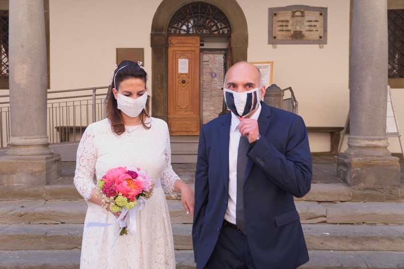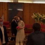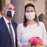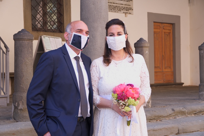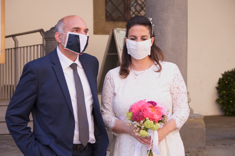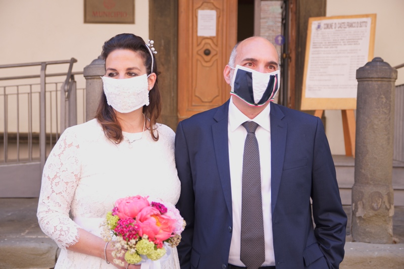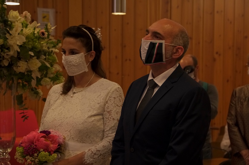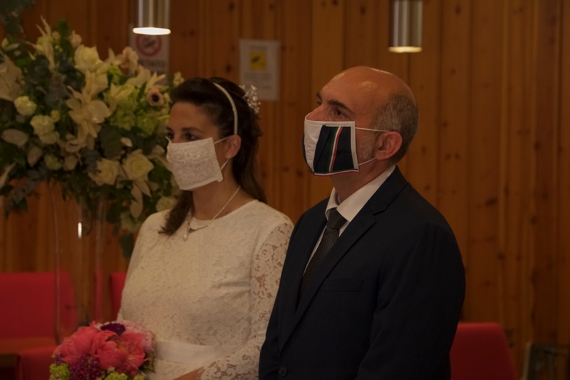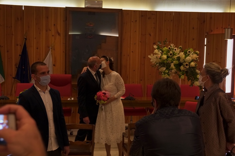 Agli sposi era concesso di non mantenere le distanze interpersonali. Così com'è stato concesso il bacio a fine cerimonia (ma sempre con la mascherina).