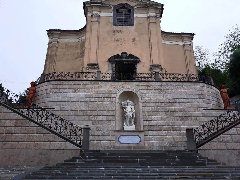 Fu progettata con la chiesa nel 1705 dall’architetto fiorentino Anton Maria Ferri per l’allora Vescovo della nostra diocesi Giovanni Francesco Maria Poggi. Le fonti riportano che nella lettera che il Ferri inviò al suo committente illustrò l’idea di collegare il santuario alla strada sottostante costruendo, di fatto, uno scenario architettonico di vasta portata e spettacolare. L’augurio che il progettista auspicava nella missiva era quello di soddisfare il gusto del Poggi.