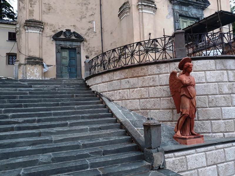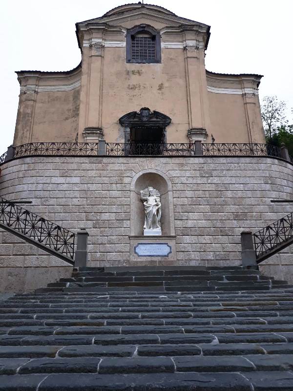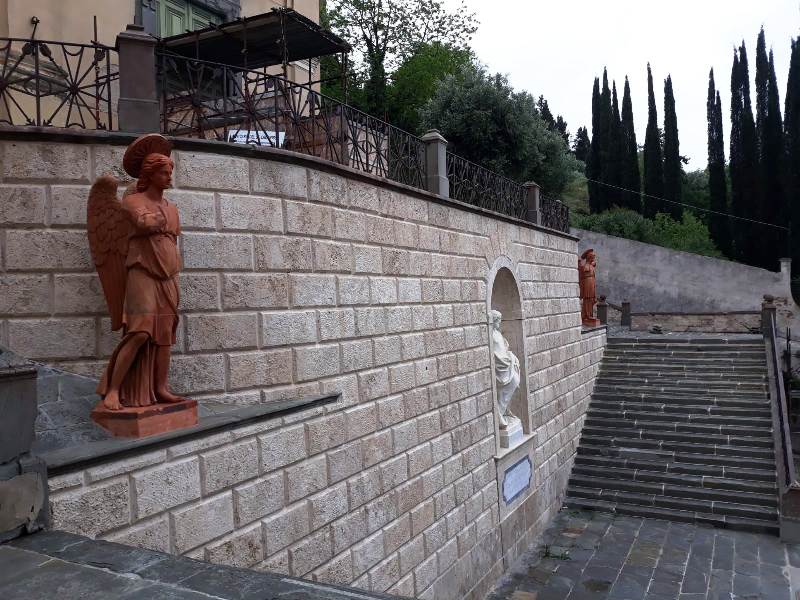 Fu progettata con la chiesa nel 1705 dall’architetto fiorentino Anton Maria Ferri per l’allora Vescovo della nostra diocesi Giovanni Francesco Maria Poggi. Le fonti riportano che nella lettera che il Ferri inviò al suo committente illustrò l’idea di collegare il santuario alla strada sottostante costruendo, di fatto, uno scenario architettonico di vasta portata e spettacolare. L’augurio che il progettista auspicava nella missiva era quello di soddisfare il gusto del Poggi.