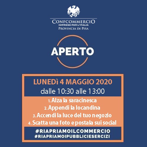 Alza la saracinesca. Appendi la locandina. Accendi la luce del tuo negozio. Scatta una foto e postala sui social con l'hastag #riaprimoilcommercio #riaprimoipubbliciesercizi. Poche e semplici le istruzioni per commercianti e imprenditori che vogliono aderire al flash mob di protesta in programma lunedì 4 maggio. E' Confcommercio Provincia di Pisa a lanciare l'invito alla mobilitazione con lo scopo di “portare all'attenzione del Governo la tremenda necessità di far ripartire l'economia, anticipando la riapertura di tutti i negozi al dettaglio al 4 maggio e di tutti i pubblici esercizi al 18” - annuncia la presidente Federica Grassini che sottolinea come “l'apertura a giugno di bar e ristoranti porterà a 34 miliardi di perdite, un terzo di tutto il fatturato del 2019 e una media tra il 20% e il 30% di negozi rischia di non riaprire mai più”.