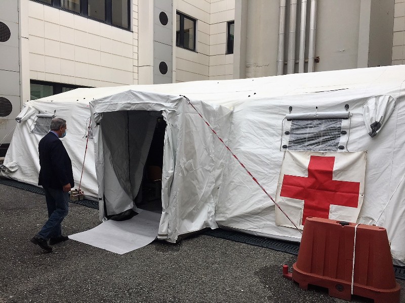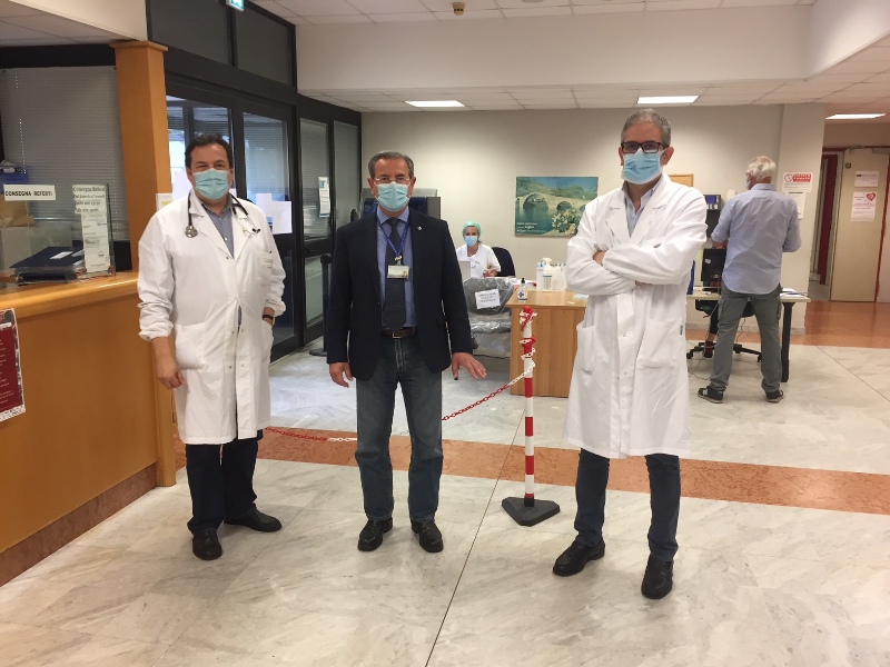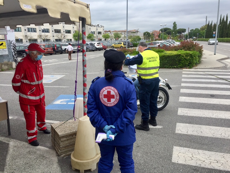 L’altro checkpoint è interno all’edificio “clinico-sanitario” ed è gestito da personale sanitario della Fondazione G. Monasterio che oltre a misurare la temperatura e a un triage di sintomi e contatti, controlla i nomi degli appuntamenti per i ricoveri, le visite ed esami ambulatoriali. La Croce Rossa e la Pubblica Assistenza hanno montato due tende a supporto delle sale di attesa dove possono rimanere anche i parenti/accompagnatori dei pazienti.