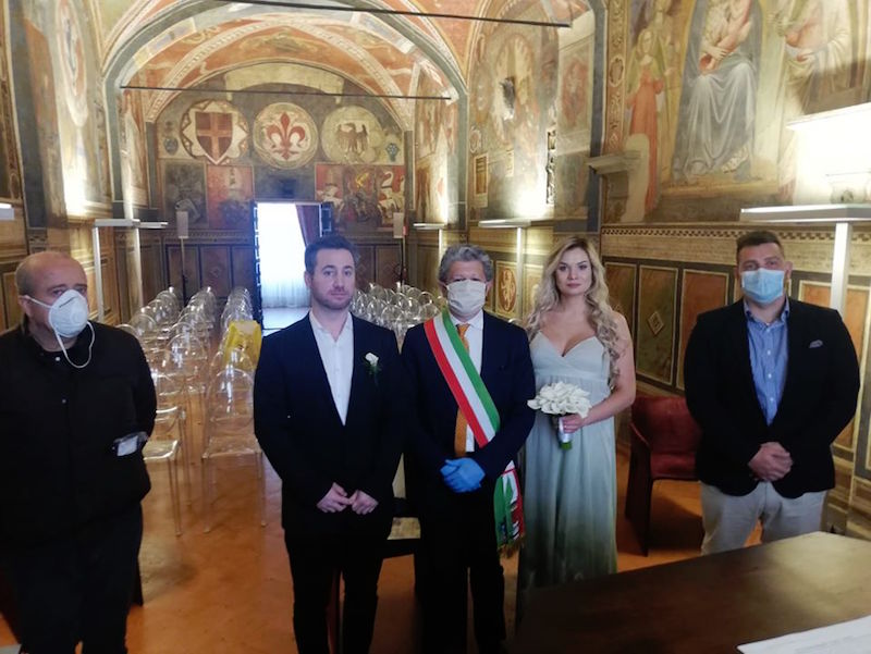 I matrimoni a San Miniato riprendono e lo fanno con un parente d'eccezione. Nella giornata di ieri, martedì 5 maggio, si sono svolte le prime nozze nell'era Covid-19 nella città della Rocca. A officiarle è stato il sindaco Simone Giglioli, ovviamente munito di guanti e mascherina.