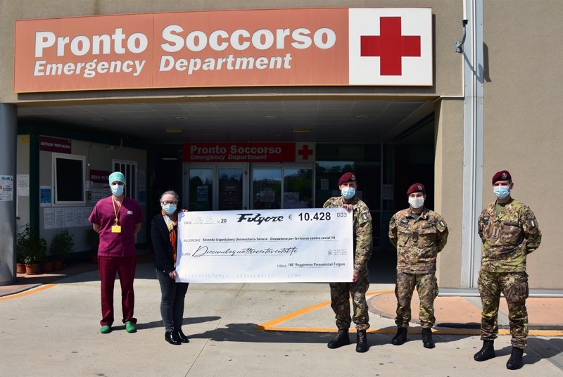 Grande generosità da parte del 186° Reggimento Paracadutisti “Folgore” per sostenere la ricerca contro il COVID-19 dell’Aou Senese. Il direttore amministrativo, Maria Silvia Mancini, ha ricevuto dai militari un’importante donazione di oltre 10mila euro a sostegno dell’ospedale Santa Maria alle Scotte, consegnata dal Colonnello Federico Bernacca, comandante del Reggimento. «E’ stata organizzata una raccolta fondi dai paracadutisti che sono stati impegnati in IRAQ per circa 7 mesi – spiega il colonnello Bernacca - Alcuni di loro sono ancora lì, altri sono rientrarti e al momento sono in isolamento, come previsto dal decreto, ma si sono tutti prodigati per fare qualcosa di concreto per il nostro policlinico. Una raccolta fatta dai soldati in prima linea per aiutare chi combatte in prima linea contro il COVID-19». Durante l’emergenza COVID la Folgore ha sempre dimostrato grande vicinanza ai professionisti dell’Aou Senese, sia con numerose donazioni di dispositivi di protezione individuale, sia mettendo a disposizione l’area della caserma “Bandini”, nel mese di marzo, per l’atterraggio dell’elisoccorso, in attesa del rifacimento dell’elisuperficie delle Scotte. «Siamo davvero grati al 186° reggimento paracadutisti Folgore per la grande sensibilità dimostrata sia in questa raccolta fondi, organizzata da chi è lontano da casa, in Iraq, impegnato in prima linea per mantenere la pace e ha il cuore rivolto a Siena, che in quella organizzata dalle famiglie dei militari – dichiara Valtere Giovannini, direttore generale Aou Senese – Abbiamo costantemente sentito la vicinanza e l’affetto di tutti i paracadutisti a cui esprimiamo i nostri più sentiti ringraziamenti». Presente alla donazione anche il coordinatore infermieristico del Pronto Soccorso, Rodrigo Lopez Pollan.