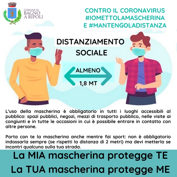 Con l’inizio della cosiddetta “Fase 2” della lotta al Covid-19, è ancora più fondamentale mettere in atto i comportamenti corretti e non abbassare mai la guardia. Per questo, l’amministrazione comunale di Bagno a Ripoli ha deciso di lanciare una nuova campagna di sensibilizzazione rivolta a tutti i cittadini affinché si mantengano le buone abitudini di contrasto alla diffusione del Coronavirus, a partire dall’utilizzo della mascherina e dal rispetto della distanza interpersonale di 1,8 metri. La campagna #IoMettoLaMascherina vedrà l’affissione di locandine realizzate dal Comune e volte a informare sulle buone pratiche di sicurezza sanitaria. I manifesti, accompagnati dallo slogan “La mia mascherina protegge te, la tua mascherina protegge me”, saranno affissi negli uffici pubblici e distribuiti nei negozi del territorio.