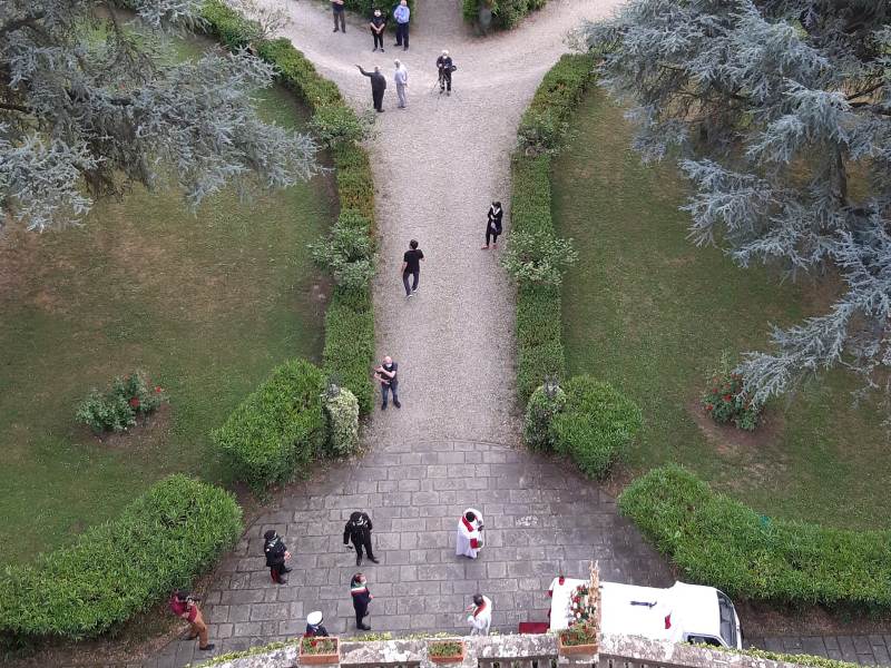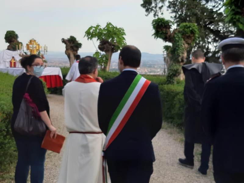 Dall'alto delle mura del castello il parroco di Montemurlo Don Gianni Gasperini, accompagnato da Don Gildas della parrocchia di Bagnolo, ha rivolto la sua benedizione a tutto il territorio, volgendo la Santa Croce verso tutti i punti cardinali.