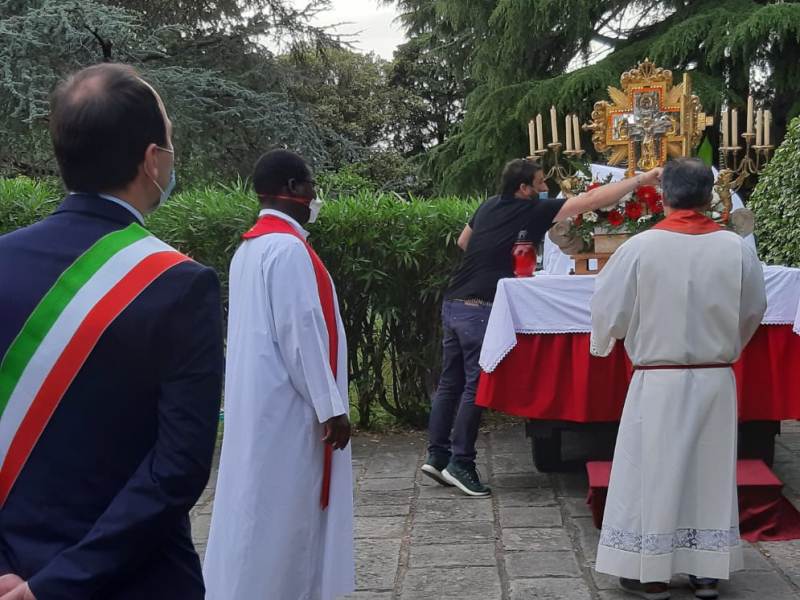 Ieri, domenica 10 maggio, a Montemurlo si è conclusa la festa patronale con il ritorno della Santa Croce alla Pieve di san Giovanni Decollato, dopo essere rimasta per una settimana, come vuole la tradizione, nella chiesa del Sacro Cuore di Montemurlo. Una cerimonia insolita a causa delle limitazioni imposte dal Coronavirus, con l'arrivo della Croce a bordo di un furgoncino, addobbato per l'occasione, ma anche molto suggestiva, perché per la prima volta il prezioso oggetto di culto è stato portato sui merli della Rocca di Montemurlo per una speciale benedizione alla città.