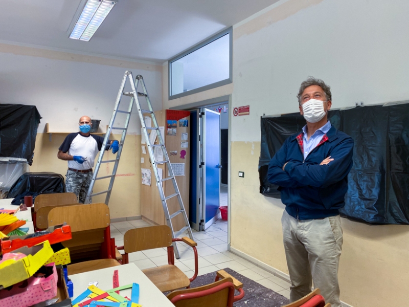 «La tinteggiatura interessa sostanzialmente tutte le stanze delle sei scuole, aule, locali tecnici e mensa. La ditta – ha spiegato l’assessore alle manutenzione Adolfo Bellucci durante un sopralluogo – provvede prima a ripristinare parti di intonaco e risanare porzioni di pareti umide, quindi si procede con la tinteggiatura. Da sottolineare che le scuole, prima del loro utilizzo, saranno sottoposte a sanificazione».