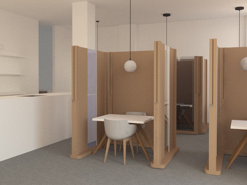 Banti e Massini suggeriscono l'utilizzo del legno per creare dei separé nei locali. "Abbiamo sentito parlare di varie ed eventuali soluzioni in plexiglass, sicuramente belle e funzionali, ma magari non alla portata di tutti", affermano, "ecco quindi l'idea del legno: non è trasparente né colorato, ma sicuramente può essere trasformato, assemblato ed è facilmente reperibile." I due giovani hanno ideato un sistema di pannelli modulari, facilmente collegabili e orientabili, adattabili a ogni situazione, siano una divisione di tavoli o una schermatura.