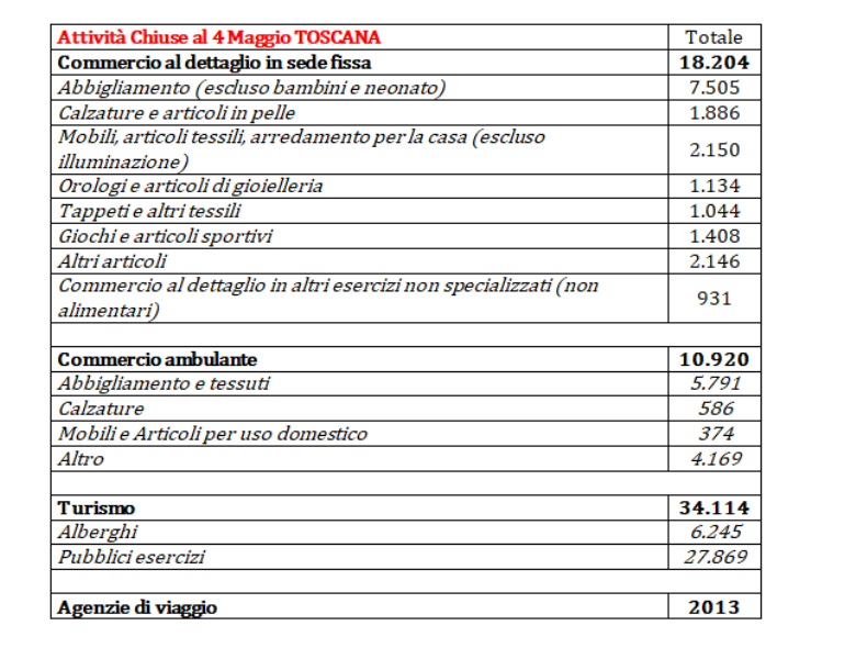 Entrando nello specifico, con l’accordo potranno riaprire in Toscana oltre 75.000 imprese rimaste escluse dalla riaperture delle settimane precedenti. Fra queste 18.000 negozi, 10.000 ambulanti, 27.000 tra ristoranti e bar solo per citarne alcune: categorie che nei mesi infiniti di lockdown hanno lasciato sul terreno oltre 2.5 mld di fatturati e che adesso potranno tornare a respirare . Interi settori caratterizzati da perdite pesantissime . Ristorazione – 1.152.104.460; Abbigliamento e Calzature 414.143.100; Alloggio – 575.164.500; Commercio ambulante - 147.420.000.