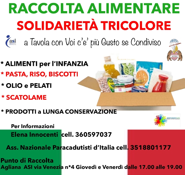 L’idea è nata in collaborazione con la sezione ASI (Associazioni Sportive-sociali Italiane) di Pistoia. È stata organizzata, ed è tuttora in corso, una raccolta alimentare: “solidarietà tricolore”. L’iniziativa vede coinvolti i comuni di Agliana, Montale e Quarrata.