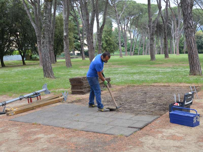 Rimosse le strutture e la pavimentazione esistente, si procederà alla realizzazione della nuova area giochi con attrezzature, arredi e pavimentazione in gomma colata, che verranno posizionati nell'estremità sud del parco, nello spazio a fianco del bar che, proprio per la presenza di tale attività, è già un luogo presidiato e di aggregazione.