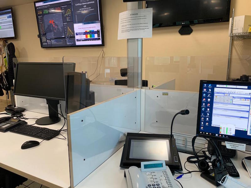 Le 12 postazioni, dove vengono ricevute le chiamate, sono distanziate più di 1 metro e mezzo e ai divisori di legno, già presenti, sono stati aggiunti dei pannelli più alti in plexiglass. Infine, ad ogni cambio turno, gli strumenti e la postazione vengono disinfettati con appositi prodotti, oltre alle pulizie ordinarie svolte giornalmente da una ditta, compresi i festivi. Provvedimenti di sicurezza ancora maggiori sono stati presi per il personale sui mezzi di soccorso a contatto diretto con le persone.