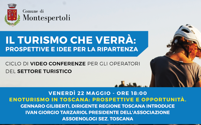 Dopo lo slittamento della scorsa settimana ricomincia il ciclo di videoconferenza gratuite organizzate da Comune di Montespertoli. Domani, venerdì 22 maggio alle ore 18:00 si parlerà di: Enoturismo in Toscana: prospettive e opportunità, con Gennaro Giliberti, Dirigente della Regione Toscana introduce Ivan Giorgio Tarzariol, Presidente dell'Associazione Assoenologi della Sezione Toscana. Venerdì prossimo, ultimo incontro di questa sezione, si parlerà di: L’unione fa la forza: esperienze di unioni di viticoltori e di marketing territoriale Per iscriversi è necessario scrivere una email a partecipazione@comune.montespertoli.fi.it