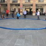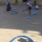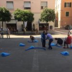 Dieci persone intente a costruire archi azzurri, utilizzando bottiglie di plastica recuperate, in Piazza Savonarola, davanti alla chiesa di san Lorenzo, Ognuno realizza un arco, nella propria postazione, nel rispetto del distanziamento fisico e delle misure di sicurezza igienica imposta dalla tragedia del coronavirus. I singoli archi collegati si uniscono, al termine, in un grande cerchio blu: la Comunità.