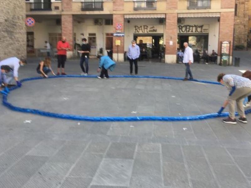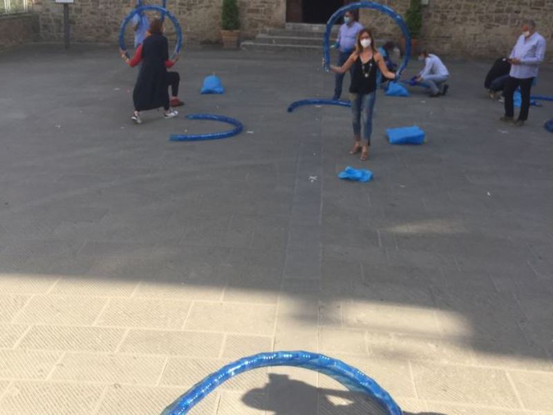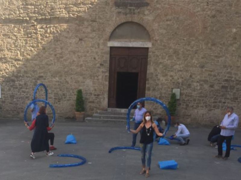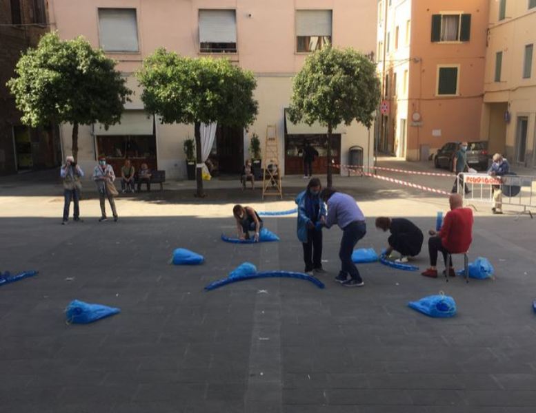 Dieci persone intente a costruire archi azzurri, utilizzando bottiglie di plastica recuperate, in Piazza Savonarola, davanti alla chiesa di san Lorenzo, Ognuno realizza un arco, nella propria postazione, nel rispetto del distanziamento fisico e delle misure di sicurezza igienica imposta dalla tragedia del coronavirus. I singoli archi collegati si uniscono, al termine, in un grande cerchio blu: la Comunità.