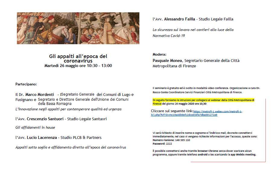 La Città Metropolitana di Firenze organizza per martedì 26 maggio 2020 un webinar formativo su 'Gli appalti all'epoca del coronavirus', rivolto agli amministratori, dalle ore 10.30 alle 13.