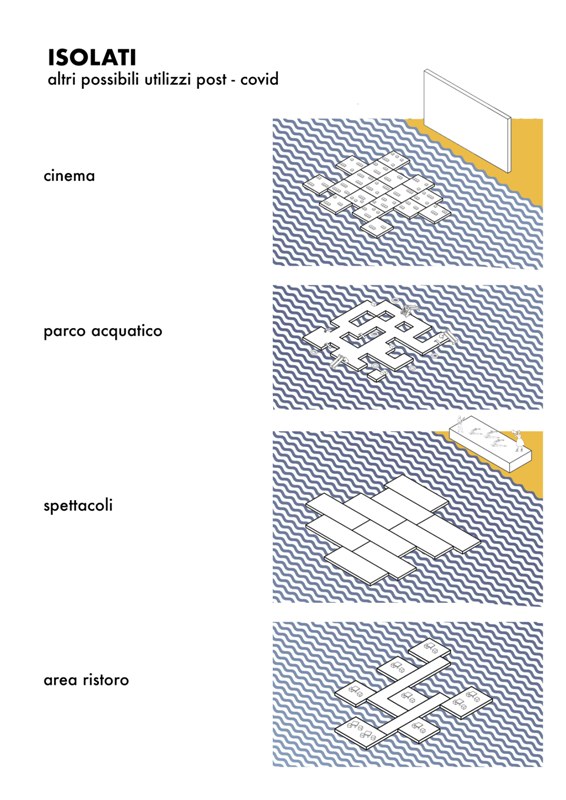 Il progetto però guarda anche a stagioni estive post Coronavirus. “Le piattaforme in futuro, fuori dalla pandemia, potrebbero continuare ad essere utilizzate unendole e creando parchi giochi acquatici per bambini, spazi collettivi per aperitivi sul mare o ospitare magari degli spettacoli. Siamo tutte appassionate di cinema – ha continuato Carlotta – e abbiamo immaginato un cinema sull’acqua, il classico film all’aperto che acquista ancora più valore perché le persone guarderebbero lo schermo in spiaggia ma sospesi in mare. Le isole potrebbero quindi ospitare spettacoli in generale e abbracciare l’arte in tutte le sue forme, sperando che la situazione odierna passi il prima possibile e puntando quindi al loro riutilizzo”.