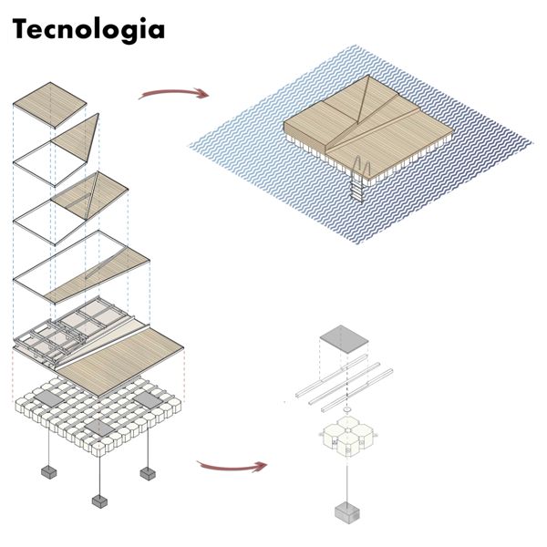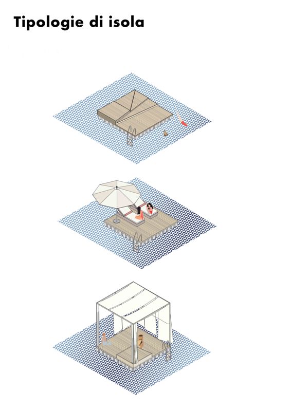 L’isola si concretizza su una piattaforma galleggiante di 3 x 3 metri, sostenuta da cubi galleggianti, ancorata al suolo e raggiungibile tramite barchette che dalla riva portano al proprio spazio sull’acqua. Potrà ospitare 2-3 persone e, a seconda delle esigenze, le piattaforme potranno essere unite in modo da far accomodare una famiglia più numerosa. La struttura è pensata per essere realizzata secondo modelli ecosostenibili nel rispetto del contesto naturale delle acque: “Per i galleggianti a sostegno della piattaforma vorremmo adottare la plastica riciclata – ha continuato Carlotta – mentre il rivestimento delle piattaforme è pensato in legno o wpc, perché non abbia un impatto troppo incisivo sul mare e perché materiale più ecosostenibile del legno forse non c’è”.