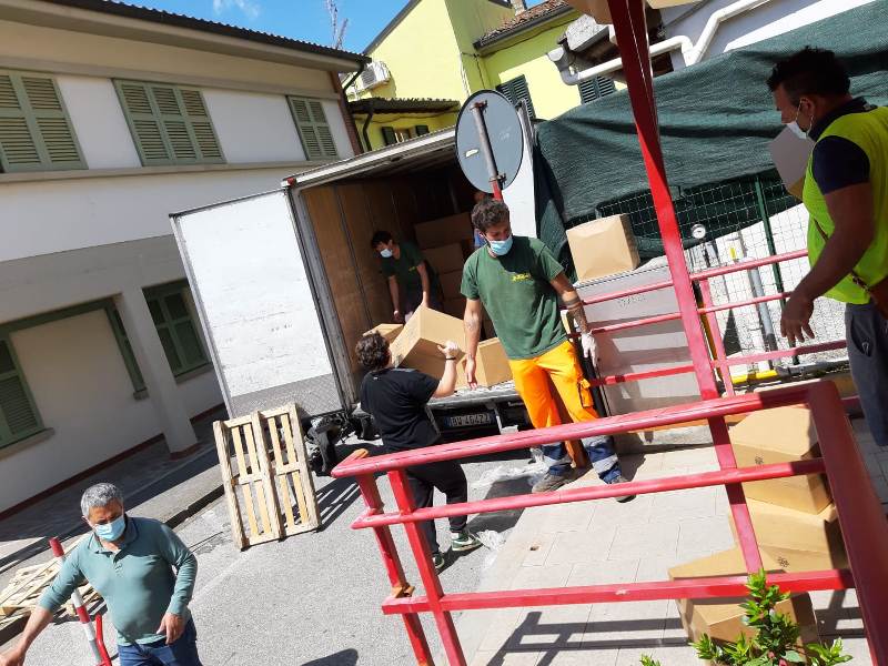Dipendenti della cooperativa e volontari si sono alternati a gruppi di 30 (il numero massimo di persone possibili per mantenere il distanziamento sociale) per garantire la consegna nei tempi.