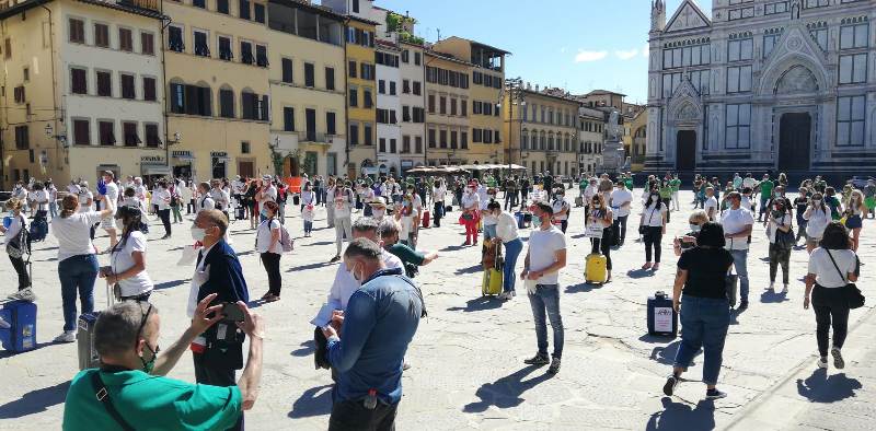 Tra frontiere bloccate per contenere la pandemia e tutte le misure di sicurezza del caso al momento, dopo il lockdown e il ritorno a lavoro di molti settori, molte attività dedicate al turismo tra cui le agenzie di viaggi non sembrano vedere un futuro certo sul loro cammino. Per questo e per molti altri motivi oggi, mercoledì 27 maggio 2020, Fiavet Toscana e molti lavoratori delle agenzie di viaggi operative sul suolo del Granducato sono scesi in piazza Santa Croce a Firenze alle 10.30. Secondo i presenti erano circa 300 i partecipanti in fronte alla basilica dell'omonimo quartiere fiorentino, tutti rispettosi del distanziamento sociale imposto dalle norme anti contagio e scanditi da t-shirt bianche, rosse e verdi, come il tricolore.