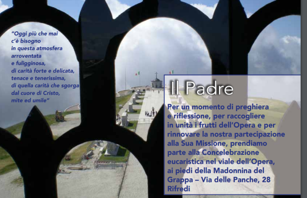 Il 2 giugno, per l’Opera Madonnina del Grappa, non è un giorno come un altro: è il giorno della festa, nel senso più vero del termine; è il giorno dell’intimità degli affetti e della comunione con il Venerabile Don Giulio; è il giorno della nascita, da quel lontano 1958, della missione affidata dal “Padre” ai suoi figli, amati e formati per raccogliere questa umile ma preziosa eredità. E ogni 2 giugno è occasione, di conseguenza, per una rinascita, per un nuovo inizio, con l’aggiunta, ogni anno, di uno spirito e di una forza sempre nuovi.