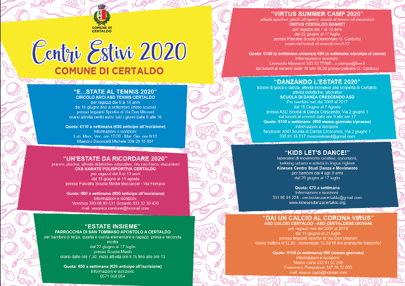 Dopo lunghe giornate di confronto e studio della normativa da un lato e delle possibili soluzioni dall’altro, Certaldo presenta le sue proposte per i centri estivi 2020 rivolti a bambini e giovani di età compresa dai 3 ai 18 anni. Proposte che vanno dalle attività più sportive a quelle più ludico ricreative, con l’obiettivo di garantire un servizio e di dare risposte alle famiglie anche in questa estate particolare che sarà l’estate post emergenza Covid-19.