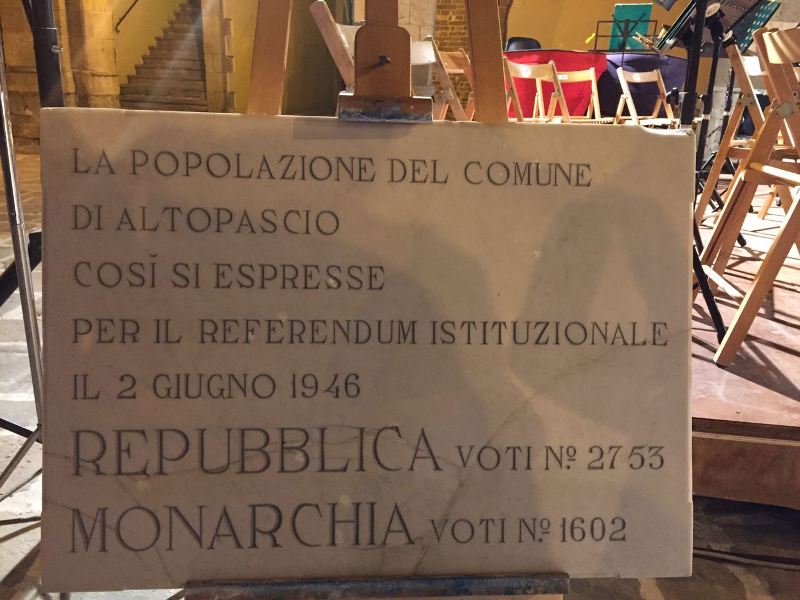 La mattina, invece, il sindaco Sara D’Ambrosio si recherà, da sola, in piazza della Magione, alla lapide che si trova sul palazzo comunale, restaurata tre anni fa dall’amministrazione, che riporta i risultati elettorali altopascesi per il Referendum costituzionale tra Monarchia e Repubblica del 2 giugno 1946: qui il primo cittadino deporrà un mazzo di fiori, come omaggio alla Repubblica, nata grazie al sacrificio di molti. Una storia di unità, coesione, uguaglianza e libertà che rappresenta il patrimonio più prezioso di cui dispone l’Italia, oggi più che mai.