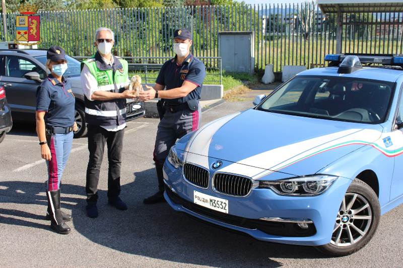 I poliziotti hanno notato il piccolo esemplare di uccello selvatico, immobile lungo il ciglio della strada, spaurito e indifeso, con le auto che gli sfrecciavano a pochi metri.