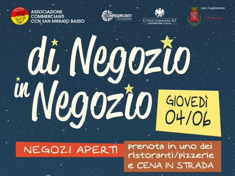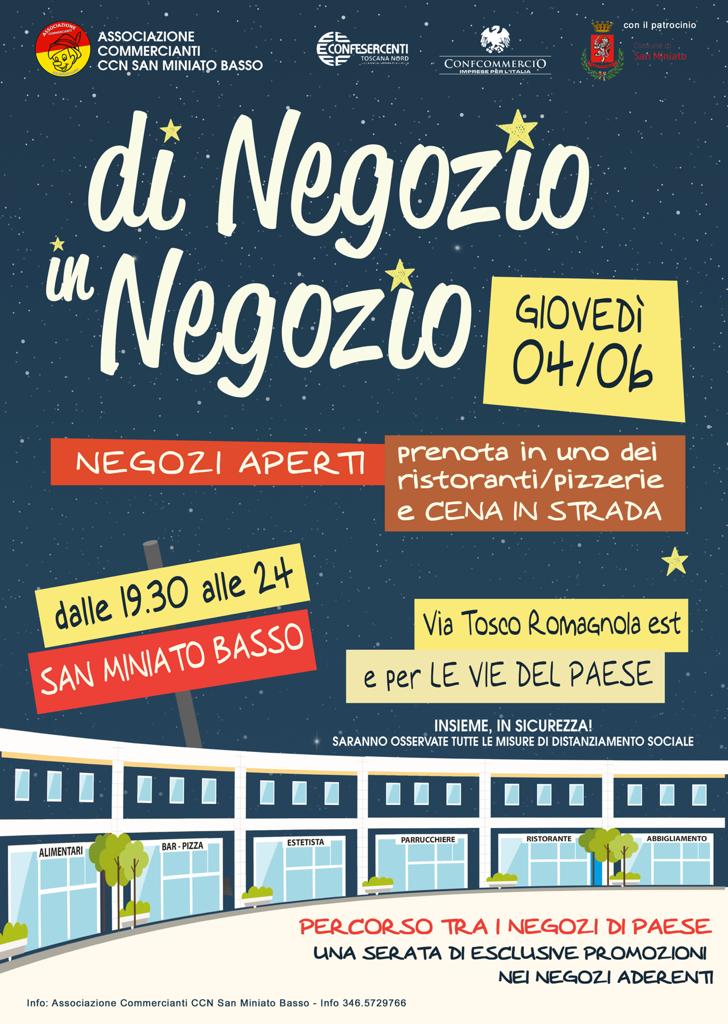 Tornare a passeggiare lungo la Tosco Romagnola chiusa al traffico, ammirare le vetrine dei negozi, godersi un aperitivo all’aperto e cenare tra ristoranti e pizzerie di San Miniato Basso. Giovedì 4 giugno inaugura Di negozio in negozio, l’iniziativa dell’associazione Commercianti Ccn San Miniato Basso per vivere il commercio locale in sicurezza.