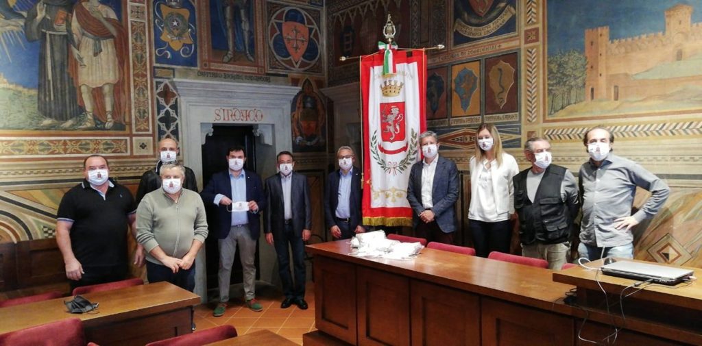Una mascherina in tessuto raffigurante lo stemma del Comune di San Miniato è l'ultimo dono realizzato da alcune aziende del territorio, in vista della festa della Repubblica di domani (2 giugno). A realizzarle sono state la Confezione Europa di Castelfiorentino, il nastrificio fratelli Bagni di San Miniato Basso e Grafiche Leonardo che ne hanno consegnate 100 al sindaco Simone Giglioli insieme al consigliere comunale Michele Fiaschi, esperto di araldica, che ha curato la raffigurazione dello stemma. "Un'altra bella iniziativa che ci aiuta a vivere meno difficilmente anche la cerimonia della festa della Repubblica del prossimo 2 giugno - spiega il sindaco -. Queste saranno infatti le mascherine che indosseremo nell'occasione. Molte aziende del territorio, durante questa emergenza sanitaria, si sono date da fare riconvertendo produzioni e inventandosi oggetti come questi, oggi parte integrante della nostra quotidianità, dimostrando un grande attaccamento alla nostra comunità e alla nostra città".