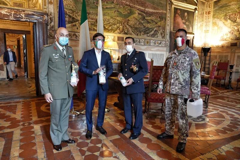 È stato in prima linea fin dall’inizio dell’emergenza Coronavirus, appena è stato possibile. Adesso lo Stabilimento Chimico Farmaceutico Militare di Firenze non cessa il suo impegno e dona al Comune disinfettante alcolico di propria produzione. Lo hanno consegnato al sindaco Dario Nardella e alla vicesindaca Cristina Giachi questa mattina a Palazzo Vecchio il Luogotenente Camillo Borzacchiello e il Tenente Colonnello Lorenzo Margheriti e il caporale maggiore capo scelto Ivo Rizza. La soluzione è destinata a essere utilizzata negli uffici del Comune.