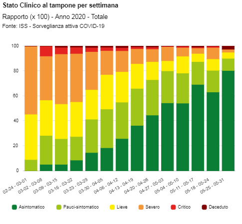 Alcune considerazioni finali su di un tema di stringente attualità. Cosa possiamo dire sulla supposta minor carica virale del virus? Questo è un tema che nelle ultime settimane ha appassionato molto media e scienziati, nel tentativo di inquadrare altri fattori concorrenti, oltre alle misure di distanziamento fisico operate dal lockdown. Sappiamo però come la perdita di virulenza non sia al momento dimostrata in vitro o nell’animale da esperimento. Quello che possiamo affermare con certezza, però, è la continua e progressiva emersione di casi asintomatici o pauci sintomatici, che in Toscana anche in quest'ultima settimana - che stiamo cominciando ad utilizzare come verifica della prima apertura (vedi figura qui sotto) - supera il 90% dei casi.