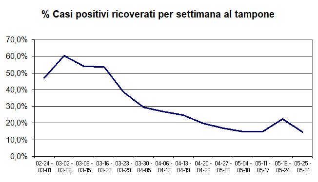 Ma la figura che meglio spiega la minor presenza di casi gravi sul totale della casistica è la percentuale di primi ricoveri sul totale dei casi per settimana di epidemia all’effettuazione del tampone: questa percentuale cala drasticamente e incessantemente rispetto ai casi evidenziati nella prima settimana di aprile fino ad oggi.