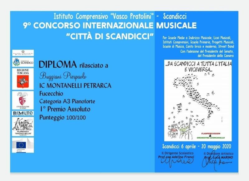 Pierpaolo Buggiani manda in estasi Fucecchio al pianoforte. Giovane talento musicale, ha solo 14 anni ma il suo nome circola già da tempo. Con il primo tempo della Sonata n.1 op.10 di Beethoven, lo studio di Chopin op.10 n.4 e Sparks di Mozkowski, ha vinto il primo premio assoluto al Concorso Musicale "Città di Scandicci" 2020 conquistando un punteggio di 100/100.