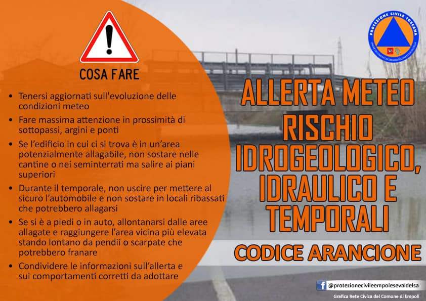 Allerta meteo di codice arancione per i rischi idrogeologico e temporali forti dal tardo pomeriggio di oggi, giovedì 4 giugno 2020, alle prime ore della mattina di domani, venerdì 5 giugno 2020. L'area toscana è quella del centro nord, dall'Empolese Valdelsa fino Valdera, passando dalle zone più a nord di Firenze, le province di Pistoia, Prato, Massa Carrara, Lucca.