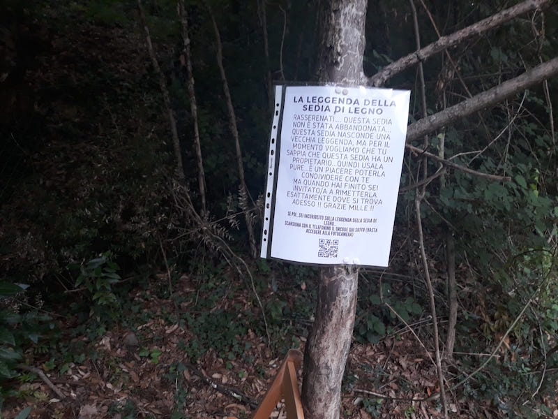 "Rasserenati, la sedia non è abbandonata", si legge sul foglio, "ma nasconde una vecchia leggenda. La sedia ha un proprietario, usala pure ma poi rimettila a posto". Il mistero si infittisce, di chi è la sedia e qual è la leggenda? La spiegazione, o meglio un aiuto, è in fondo, poco sopra un Qr Code: "Scansionalo col telefonino per sapere la leggenda della sedia di legno".