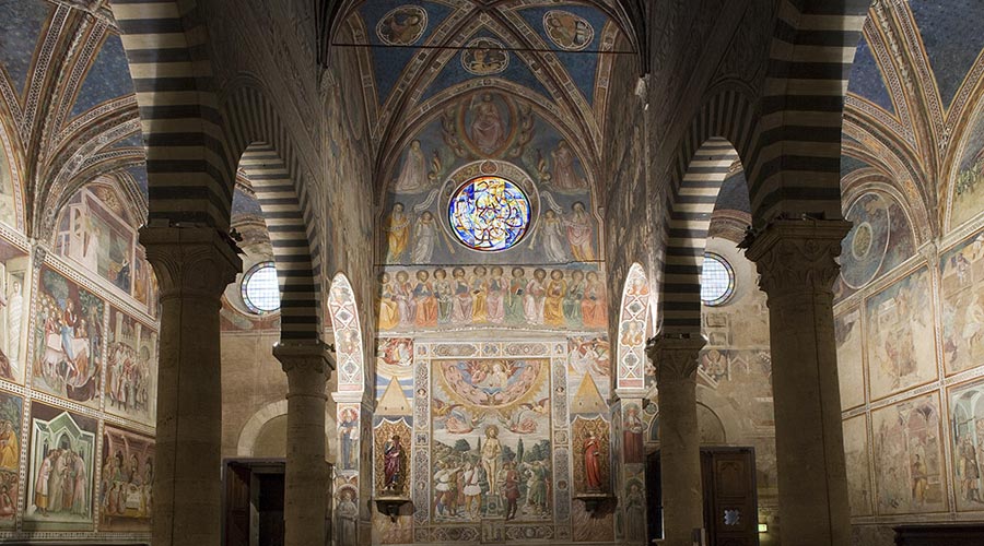 Le pareti della chiesa sono interamente coperte da affreschi che raccontano le Storie del Nuovo e del Vecchio Testamento dipinte da illustri pittori della scuola senese del XIV secolo. Sulla parete destra è possibile ammirare un ciclo di affreschi del Nuovo Testamento, capolavoro di Lippo e Federico Memmi. Sulla parete di sinistra sono narrate le Storie del Vecchio Testamento, realizzate nel 1367 da Bartolo di Fredi. Nel Duomo è inoltre possibile ammirare un gioiello del Rinascimento, la Cappella di Santa Fina ove hanno lavorato insieme tre artisti fiorentini di grande fama: un architetto, Giuliano da Maiano, uno scultore, Benedetto da Maiano e un pittore, Domenico Ghirlandaio.