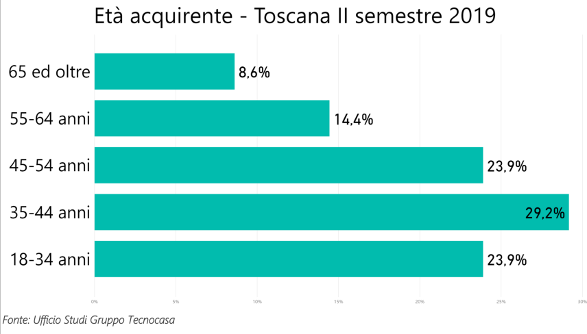 Il 29,2% degli acquirenti in Toscana ha un’età compresa tra 35 e 44 anni. Rispetto al primo semestre del 2019 si registra un aumento della percentuale nella fascia 35-44 anni (che rappresentava il 24,3%).