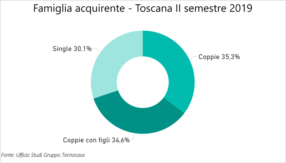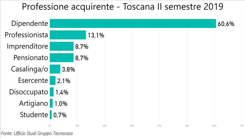 In Toscana il 60,6% degli acquirenti è un lavoratore dipendente (in leggero calo rispetto al primo semestre 2019 quando rappresentava il 64,7%). In crescita le percentuali di professionisti ed imprenditori che erano rispettivamente del 9,7% e 5,9.