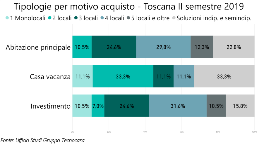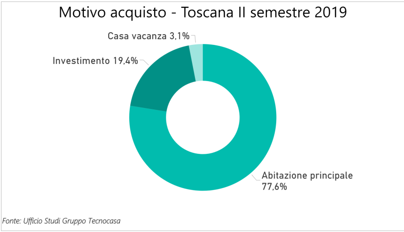 L’analisi delle compravendite realizzate attraverso le Agenzie Tecnocasa e Tecnorete in Toscana evidenzia che nel primo semestre del 2019 il 77,6% degli acquisti ha riguardato l’abitazione principale, il 19,4% la casa ad uso investimento ed il 3,1% la casa vacanza. Rispetto al primo semestre del 2019 si registra un leggero aumento della percentuale di acquisti per investimento.