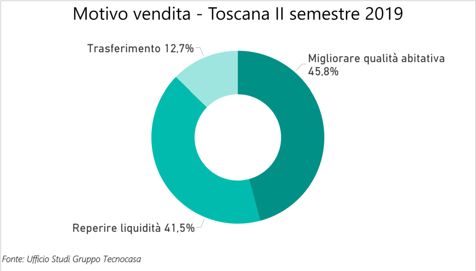 Analizzando le compravendite dal lato del VENDITORE, nel secondo semestre del 2019 la maggior parte delle persone ha venduto per migliorare la qualità abitativa (45,8%) seguita da coloro che hanno venduto per reperire liquidità (41,5%) ed infine da chi si è trasferito in un altro quartiere oppure in un’altra città (12,7%). Rispetto allo scorso semestre le percentuali sono rimaste tendenzialmente invariate.