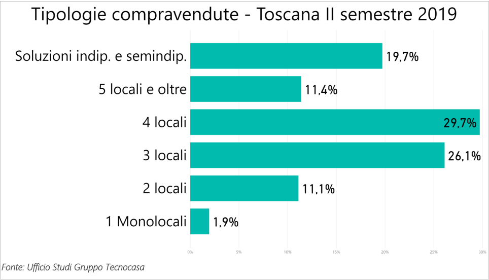 In Toscana chi compra l’abitazione per viverci sceglie principalmente i quattro locali (29,8%), seguiti dai tre locali (24,6%), e dalle soluzioni indipendenti e semindipendenti (22,8%).