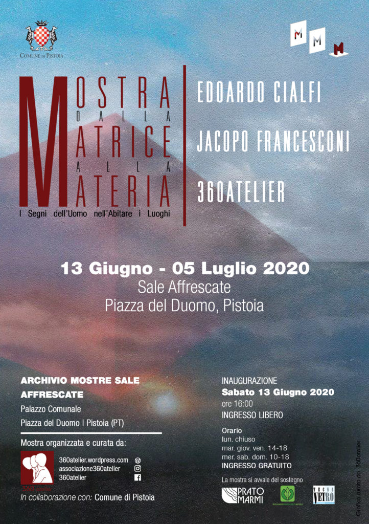 Nello spazio espositivo delle sale Affrescate del Palazzo comunale, in piazza del Duomo, sabato 13 giugno, alle 16, si terrà l’inaugurazione della mostra Dalla Matrice alla Materia a cura del gruppo culturale 360atelier. Realizzata in collaborazione con il Comune di Pistoia, vede protagonisti gli artisti Edoardo Cialfi e Jacopo Francesconi.