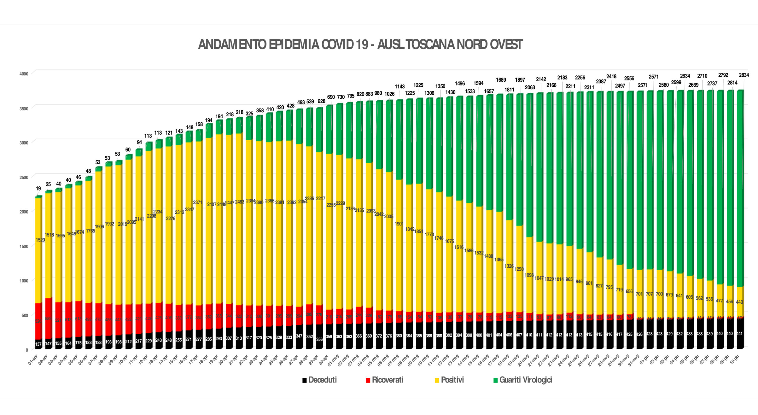 Si ricorda che l’Asl Toscana nord ovest, con la sua statistica, incrocia vari dati legati ai pazienti e lavora sulla residenza, e non sul domicilio, delle persone. Per questo ci possono essere delle piccole discrepanze rispetto ai dati per domicilio ed a quelli legati alla provincia di richiesta dei tamponi (quest’ultimo criterio è quello utilizzato dalla Regione Toscana nei suoi bollettini quotidiani).