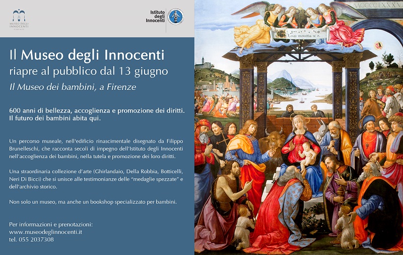 Il Museo è visitabile con nuovi orari dal giovedì al lunedì dalle 16.00 alle 20.00. Mascherina, distanziamento tra i visitatori ed ingressi scaglionati sono le precauzioni necessarie per accedere, in linea con le direttive regionali e nazionali che riguardano i musei, alle sale che raccontano il passato e il presente della più antica istituzione pubblica italiana dedicata all’accoglienza dei bambini e alla difesa dei loro diritti.Una cerimonia di riapertura del Museo si svolgerà domani 13 giugno alle ore 16.00 alla presenza dei vertici dell’Istituto degli Innocenti e delle autorità.