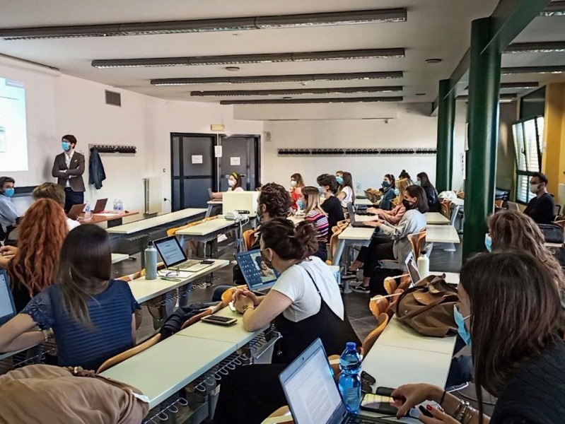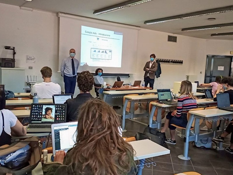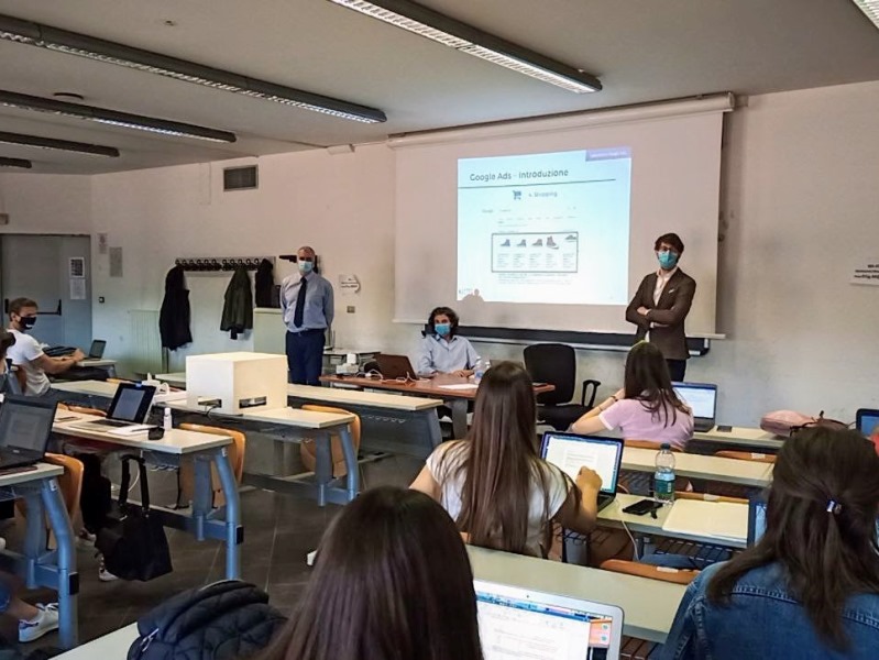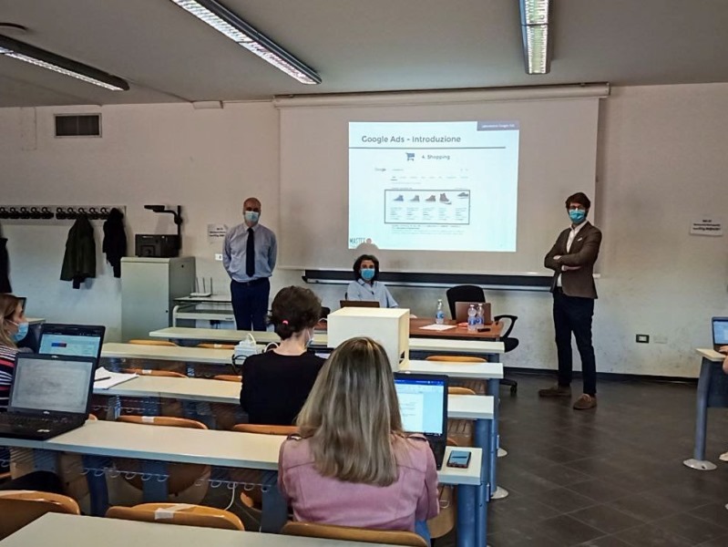 L’emozione in aula è reale tra i presenti durante la lezione di Search Marketing, tenuta da Eduardo Bini, e grandi sorrisi spuntano al di sotto delle mascherine.